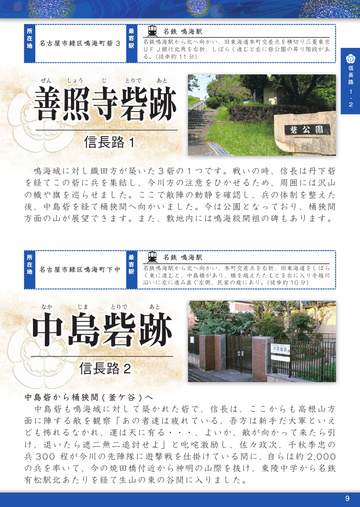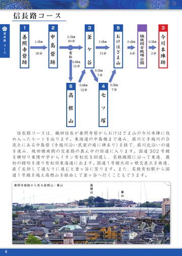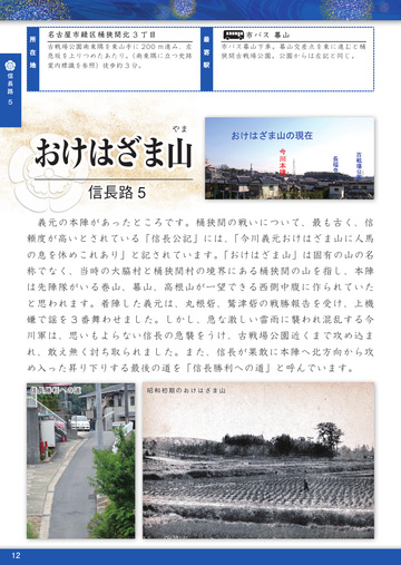 信長路コースは、織田信長が善照寺砦からおけはざま山の今川本陣に攻 め入ったルートを辿ります。東海道の中島橋まで進み、扇川と手越川の合 流 点 に あ る 中 島 砦( 手 越 川 沿 い 民 家 の 庭 に 碑 あ り ) を 経 て 、扇 川 北 沿 い の 道 を進み、焼田橋南側の交差路の真ん中の旧道に入ります。国道 302 号線 を横切り東陵中学からイオン有松北を回遊し、名鉄線路に沿って東進、最 初 の 踏 切 を 渡 り 有 松 旧 東 海 道 に 出 ま す 。国 道 1 号 線 大 将 ヶ 根 交 差 点 を 南 進 、 直 ぐ 左 折 し て 道 な り に 進 む と 釜 ヶ 谷 に 至 り ま す 。ま た 、名 鉄 有 松 駅 か ら 国 道 1 号線を越え高根山を経由して釜ヶ谷へ行くこともできます。