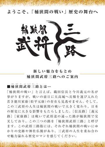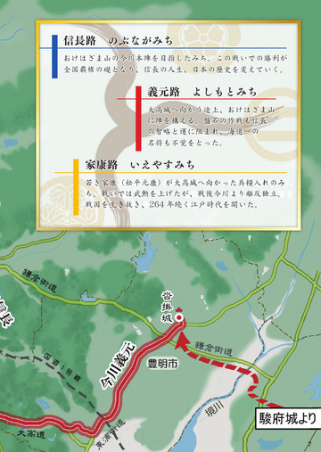 「 桶 狭 間 の 戦 い 」 と 言 え ば、 織 田 信 長 と 今 川 義 元 の 名 が 挙がりますが、戦いの前日に大高城へ兵糧を運び入れた 若き徳川家康 (松平元康) の 存 在 も 見 逃 せ ま せ ん 。そ し て 、 この三武将の人生は桶狭間の戦いで大きく変わり、日本 の歴史に大きな影響をもたらしました。 [信長路] [義元 路] [家康路]は戦いで武将達の通った路が桶狭間で交 叉しており、この三つの路を「桶狭間武将三路」と呼び ます。この武将三路筋には、それぞれ桶狭間の戦いにゆ かりの史跡や神社仏閣があり、三武将の人生を重ね合わ せ魅力溢れる歴史ロマンを感じてください。