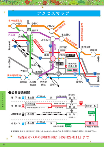 ①名鉄名古屋本線有松駅下車、国道1号線まで出て、市バス「有松小学校」から幕山 (市バス:高速1・要町 1・鳴子 13・緑巡回の4路線あり) 下車(約 8 分) 、信号東へ 100 m。 ②市バス栄バスターミナル 22 番乗り場、高速 1 号(森の里団地行き) 幕山下車(約 40 分) 、信号東へ 100 m。 ③JR大高、南大高駅下車、市バス緑巡回左廻り(有松駅行き) 幕山下車(約 20 分) 、信号東へ 100 m。